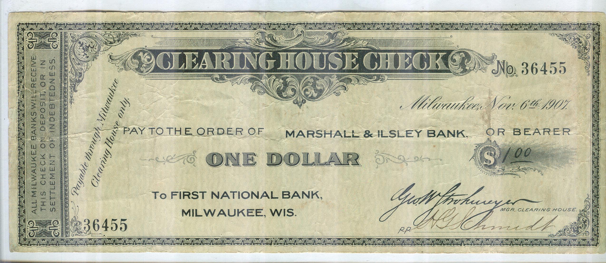 Eleven banks were members of the Milwaukee Clearing House and issued notes called "panic scrip". They were used from October, 1907 to February, 1908. The Milwaukee pieces were issued in $1, $5, and $10 denominations. They are listed in a newly released book, Panic Scrip of 1893, 1907 and 1914, by Neil Shafer and Tom Sheehan.